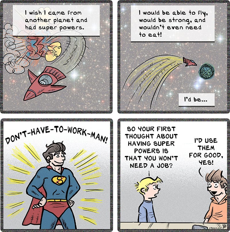 And, yes, I may have thought about Superman not needing to work. I think not needing shelter is a heck of a power. He has free housing in the form of ice in his Fortress of Solitude. It’s not like he has to worry about doctor bills. His one illness can be cured by crawling away from the green rock. What else can human society offer him? Transportation? Doesn’t need it. Education? The rocket he came here in had all of that. Boredom! He doesn’t have a power to fight that. Superman is here because he loves to read the comics we make about him. It all makes sense now.