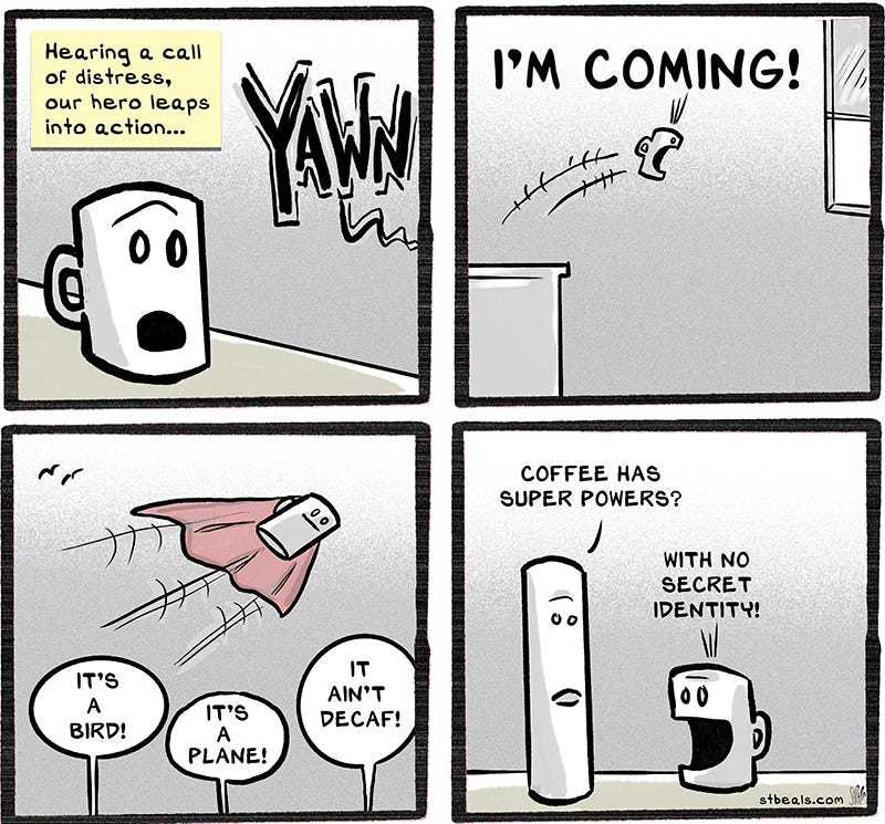 I don’t have any talking dogs in my comic. Signs and even coffee cups can be alive, but there are no talking dogs. In fact, when people ask me what my comic is about, I usually say “Well, there certainly are no talking dogs!” This is because I enjoy being vague.