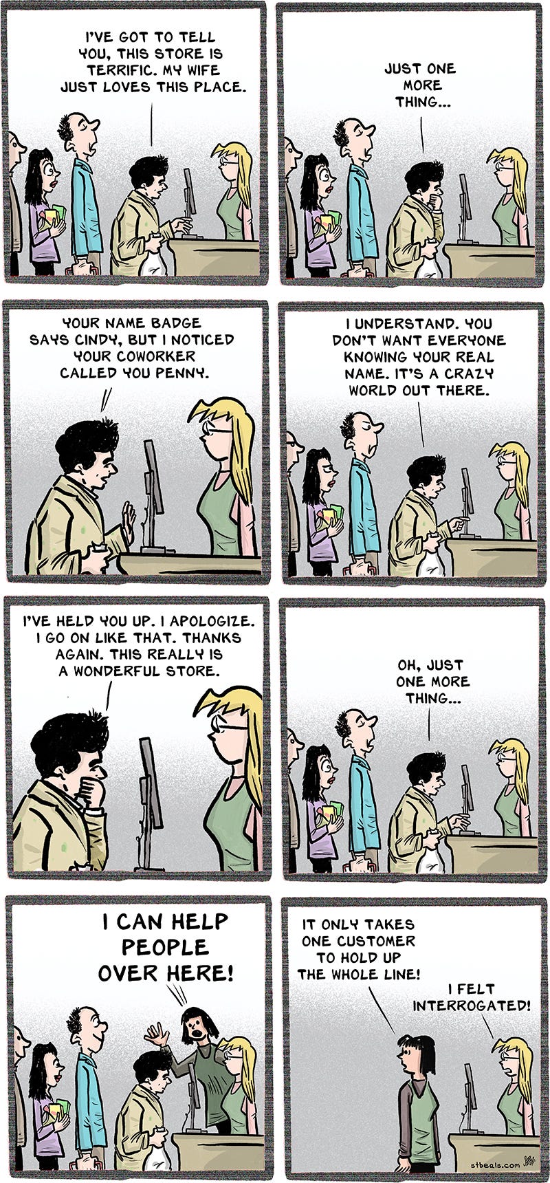 This wrote itself. Long line. The guy taking his sweet time seemed to acknowledge and then ignore that he was holding everyone up. He was very likeable, so it was hard to get mad. I was helping Columbo.