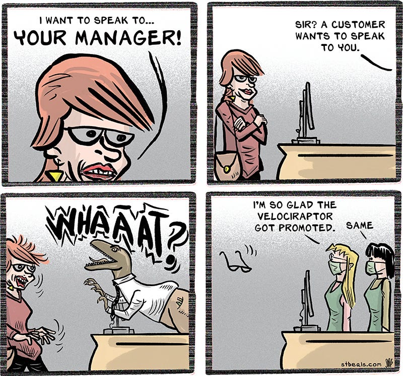 This was a very popular comic and I don’t remember the exact origin. The person who originally inspired Tabby wanted a velociraptor as a manager and I can’t remember why or how that even came up in conversation.