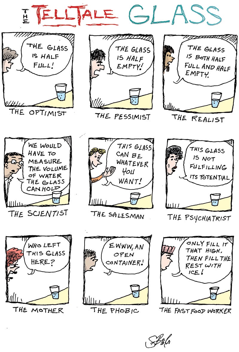One of my favorites. I haven’t heard of anyone seriously presenting a glass half full/empty question since I was a kid. I thought it was a dumb question, so it deserved dumb answers.